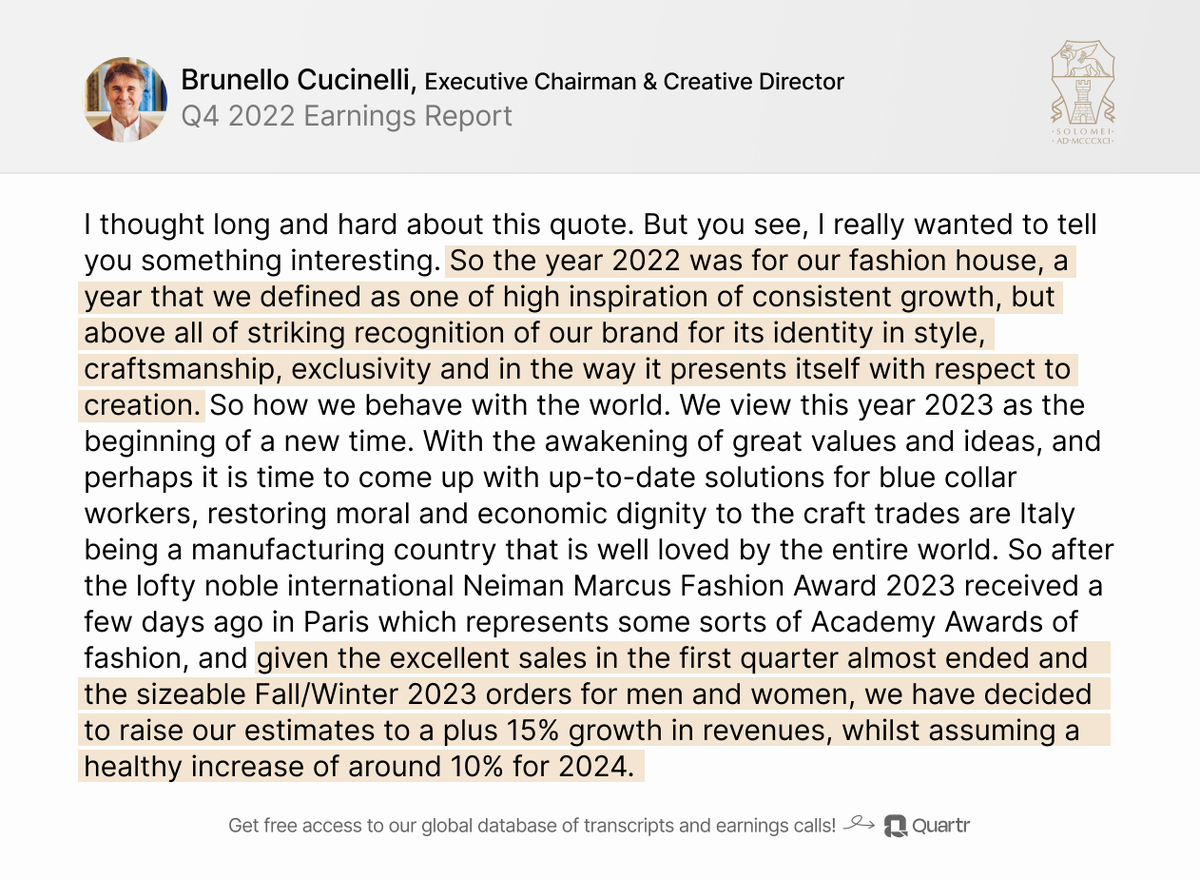 5. Italian high-end cashmere house $BC.MI raised its 2023 revenue guidance from +10 to +15%, and are already confident in another +10% for 2024: