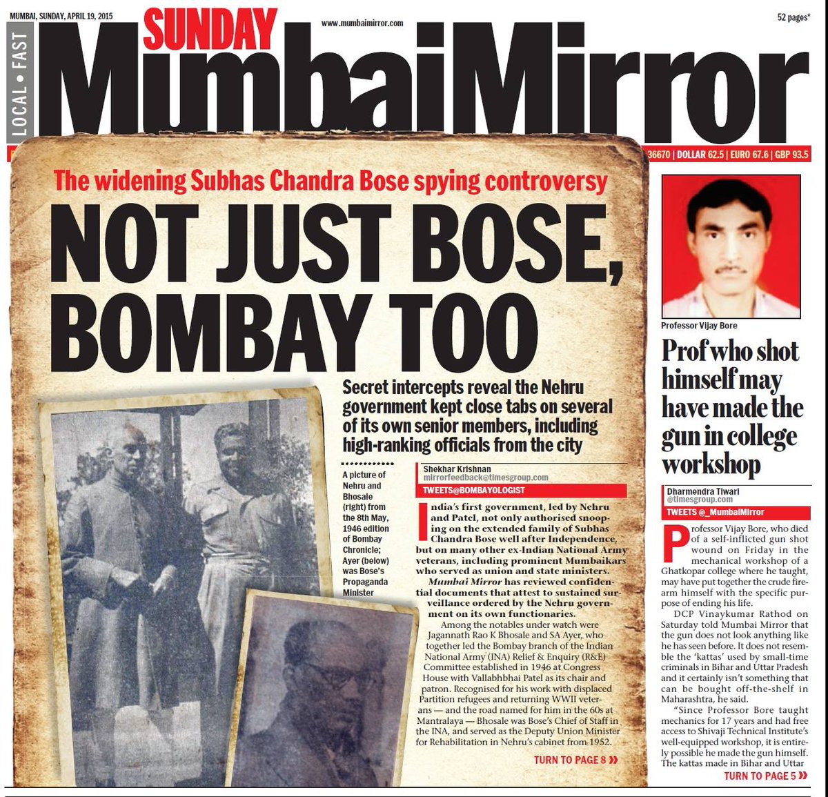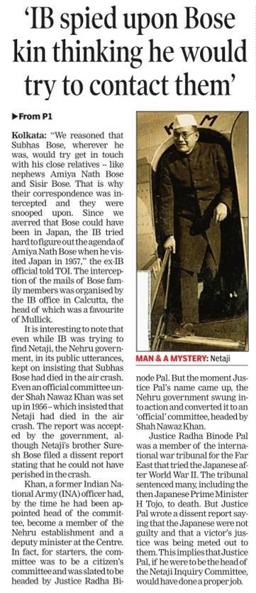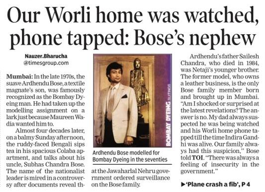 Ardhendu Bose, a former Bombay Dyeing model and nephew of Netaji, disclosed to @timesofindia this day in 2015 that his father Shailesh, Netaji's younger brother, "always suspected he was being watched and his Worli home phone tapped till the time Indira Gandhi was alive".