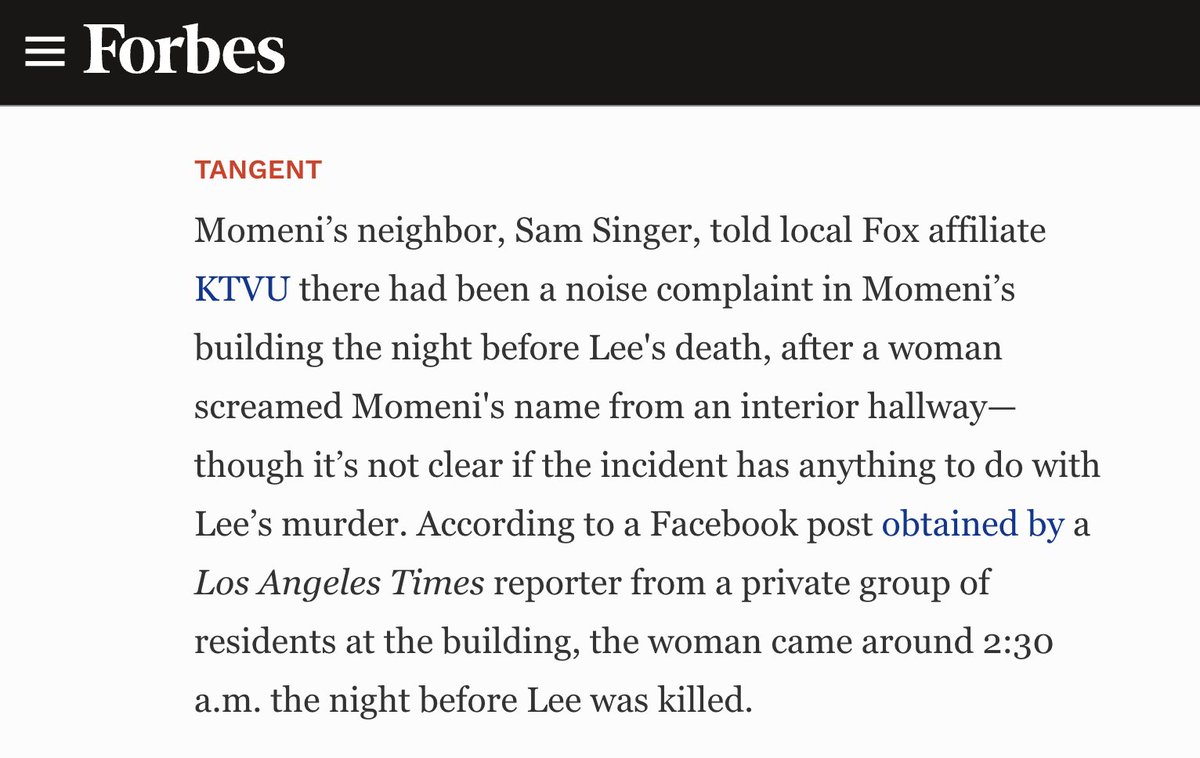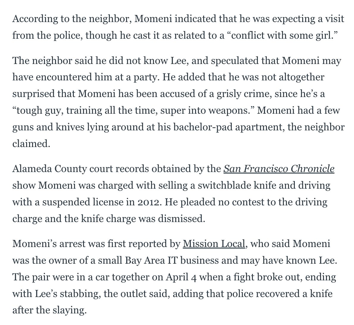 Momeni is the owner of Expand IT, described as a “one-stop technology and security provider” for enterprise software companies. Lee and Momeni had driven together through downtown SF just hours before Lee was killed, after the two reportedly argued, police told Mission Local.
