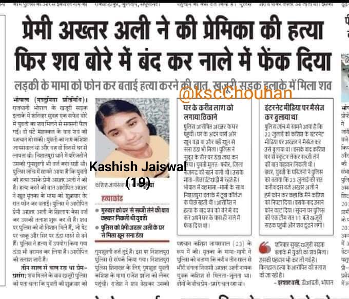 111. खजूरी, भोपाल, MP/ 23 जुलाई 2021: हिंदू लड़की कशिश जयसवाल (19) की हत्या प्रेमी ने कर शव को बोरे में भरकर नाले में फेंका! आरोपी अख्तर अली