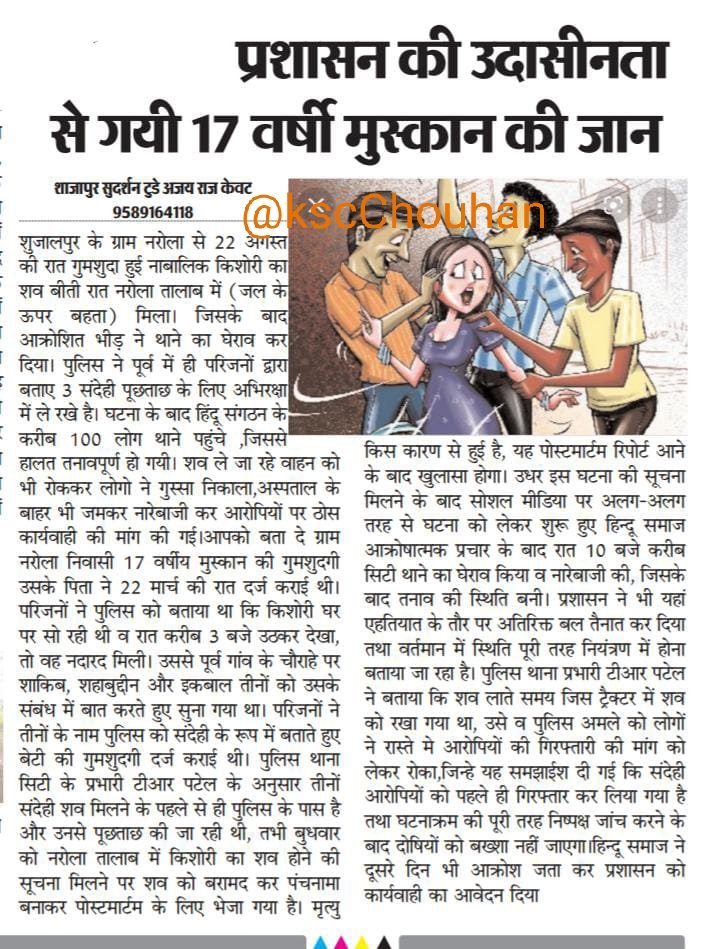 112. नरोला, शुजालपुर, शाजापुर, MP/ 24 अगस्त 2021: दलित हिंदू लड़की मुस्कान (17) को लव जिहाद का शिकार बनाया फिर सामुहिक रेप किया & हत्या कर लाश को नाले में फेंका! आरोपी: शाकिब, शाहबुद्दीन, इकबाल