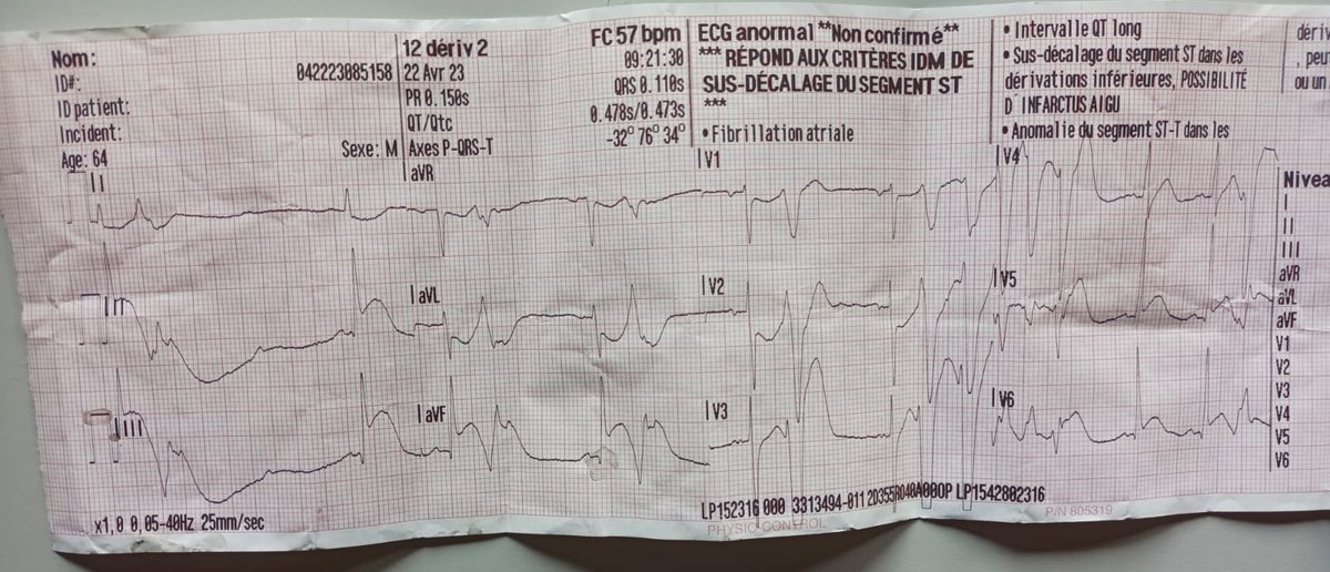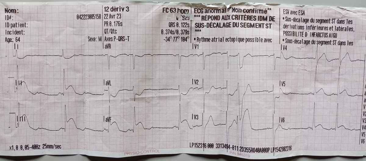 Initial EKG shows an inferior STEMI (OMI) + conduction impairment of the P wave, compatible with a type 2 AVB.