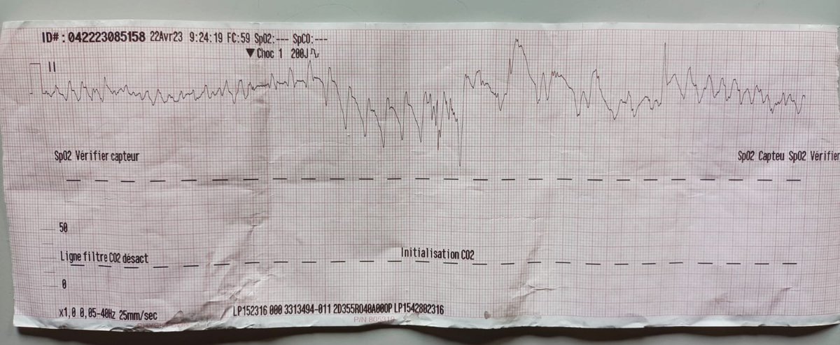 3min later, just before being installed on the angio table, patient's rythm turns to FV.