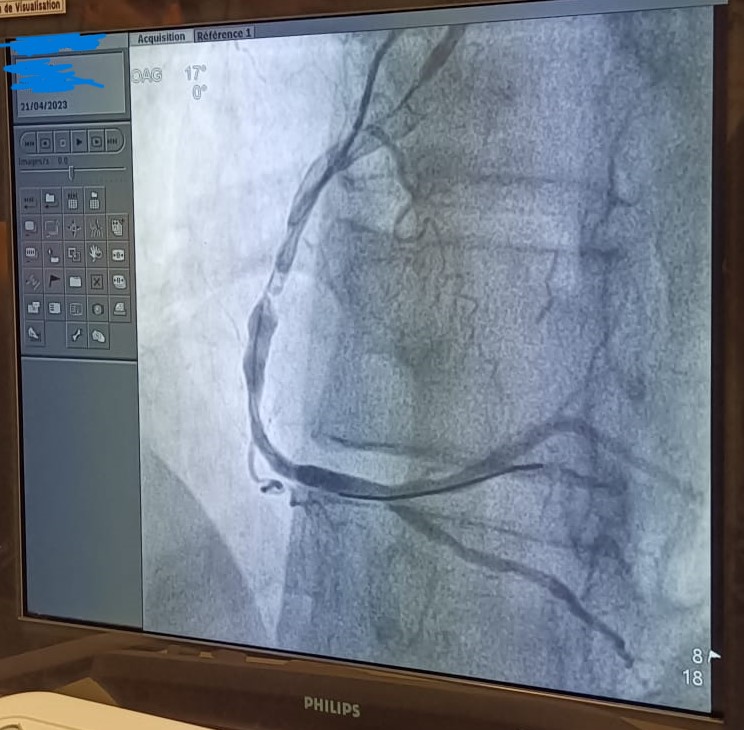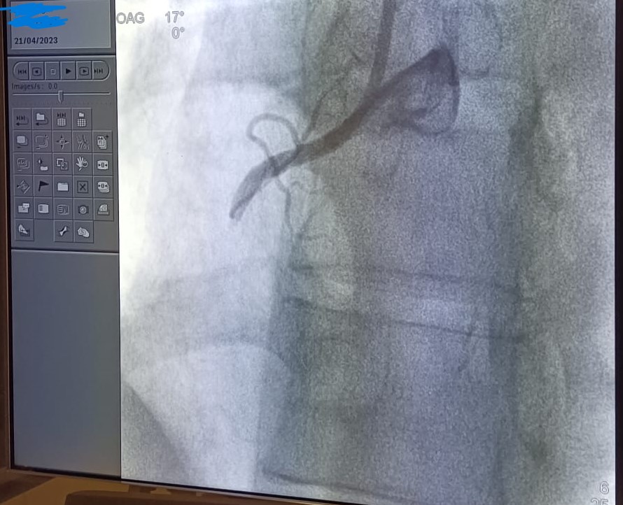 Coronary angiography is performed immediately after. We are 35min from the initial EKG, and about 65min from the beginning of the chest pain.