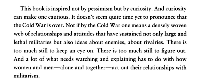 Reading Enloe's book gives a whole new understanding to the need for "rogue" states in the post-Cold War world (we need threats in a militarized society)...