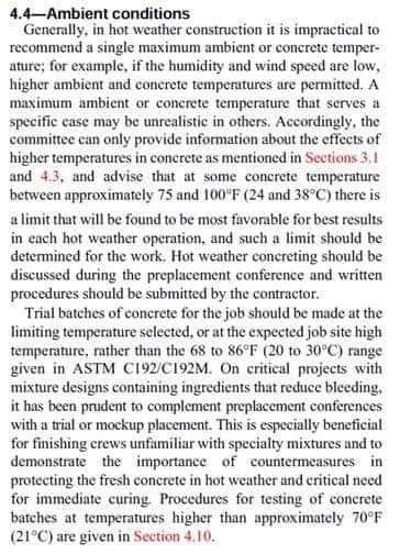 - ((أثناء عمليات البناء خلال الاجواء الحارة فالتوصية بدرجة حرارة قصوى للجو أو للخرسانة هو إجراء ((#غير_عملي))