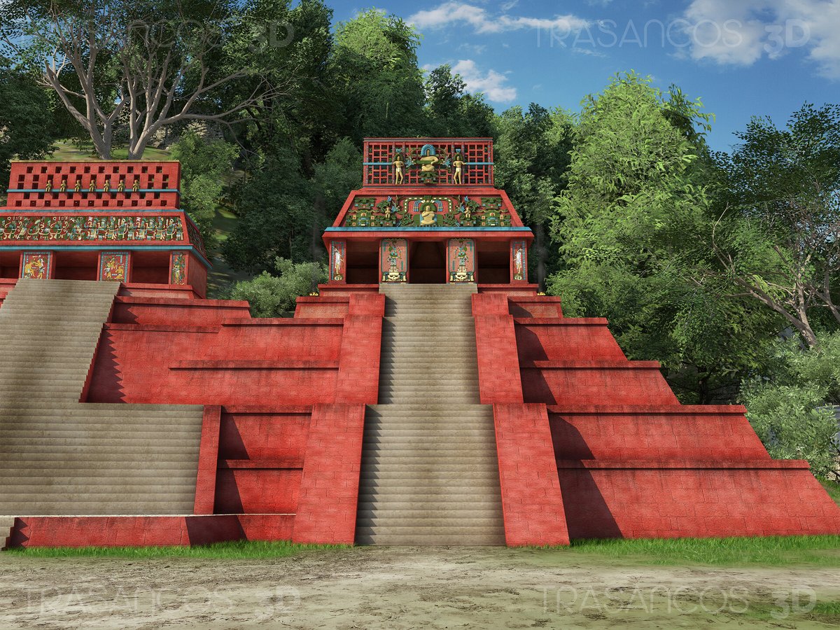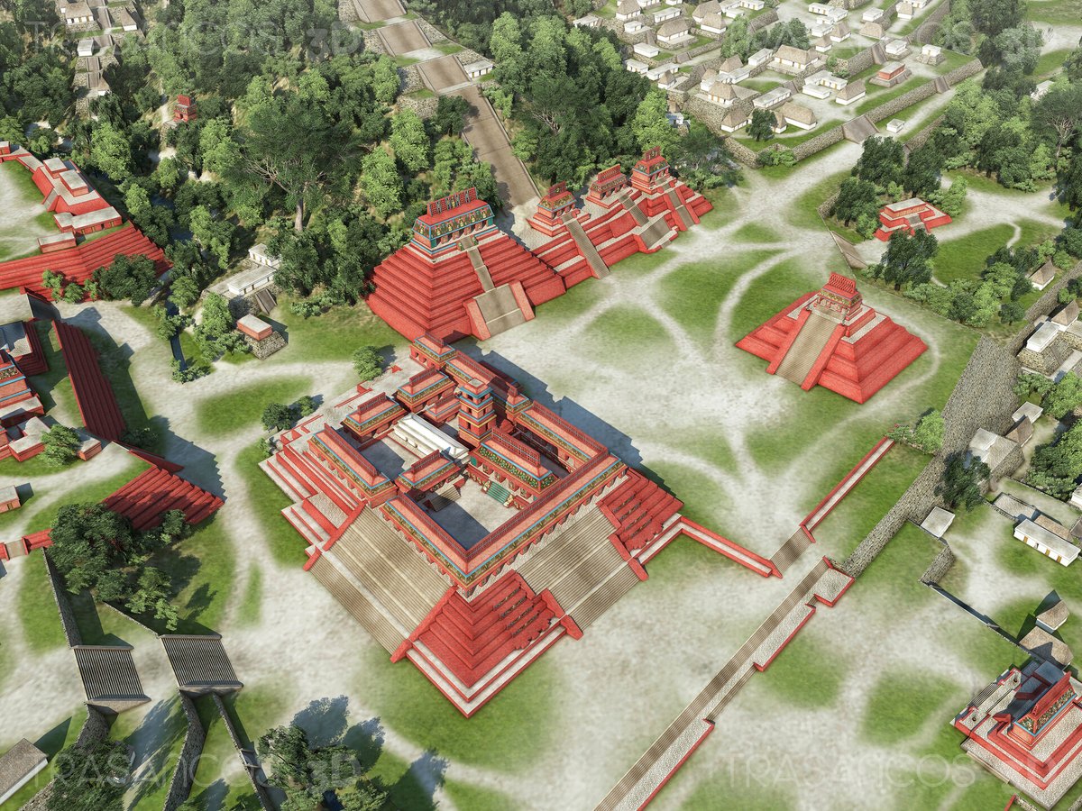 It is believed that the entire city of Palenque was once coloured with cinnabar, as in these digital reconstructions by Anxo Miján Maroño. The temples and palaces were once covered with stucco and painted red, vermilion, and scarlet; it must have been quite a sight to behold.