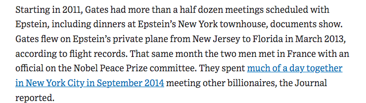 While he was working on the charitable fund, Epstein met in 2013 with Gates and Norwegian officials. Epstein told one former Gates Foundation employee that he knew the Norwegians, and could help Gates win a Nobel Peace Prize for his efforts to eradicate polio.