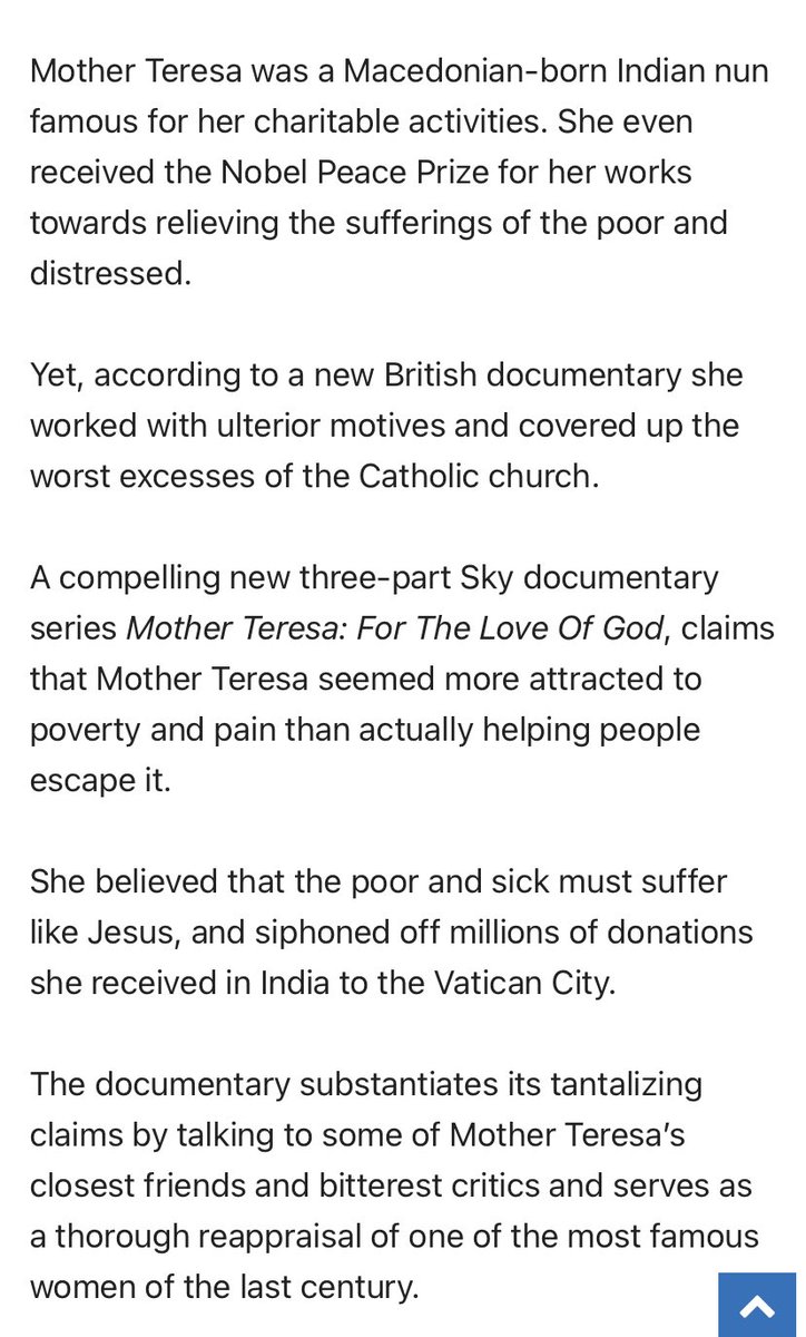 “She believed that the poor and sick must suffer like Jesus, and siphoned off millions of donations she received in India to the Vatican City.”