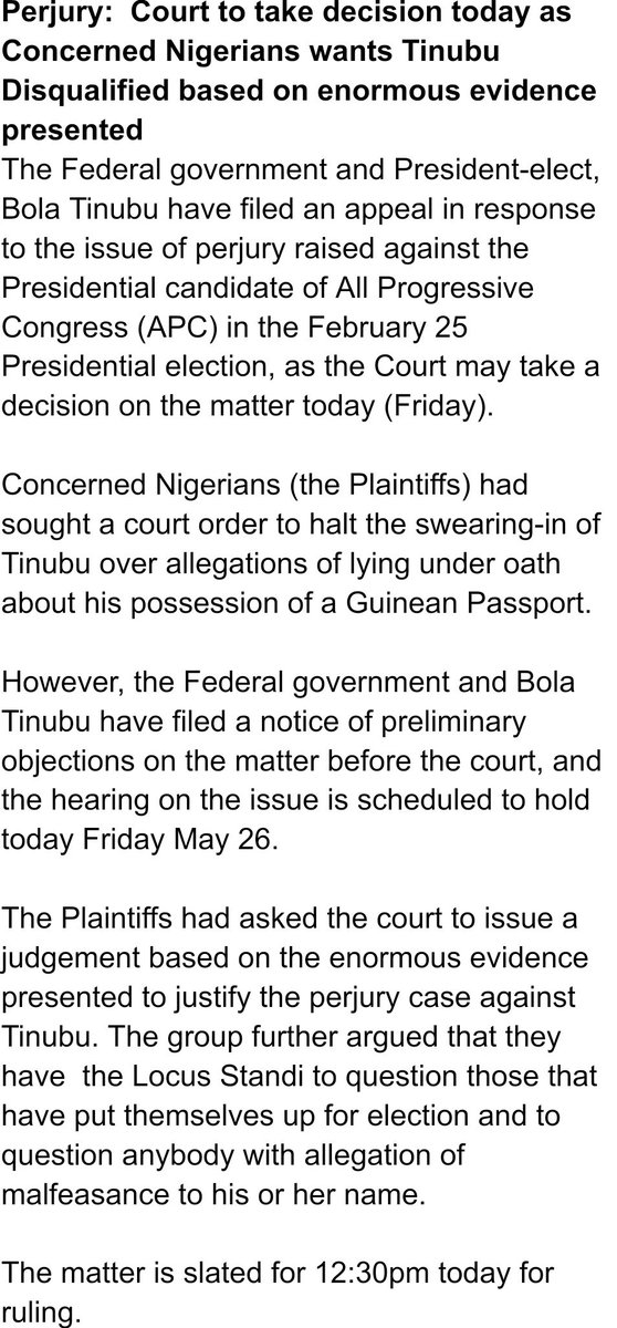 Press Release from Concerned Nigerians Tinubu’s lawyers have filed a response to perjury case, and court decision is due today.