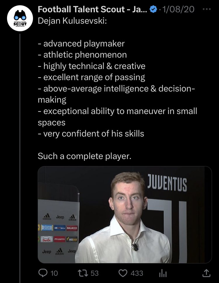 In conclusion, I think Kulusevski is a #10, and in the long-term Tottenham should play him in that position. That way they can upgrade the goal impact of the RW and add more explosiveness to its wings