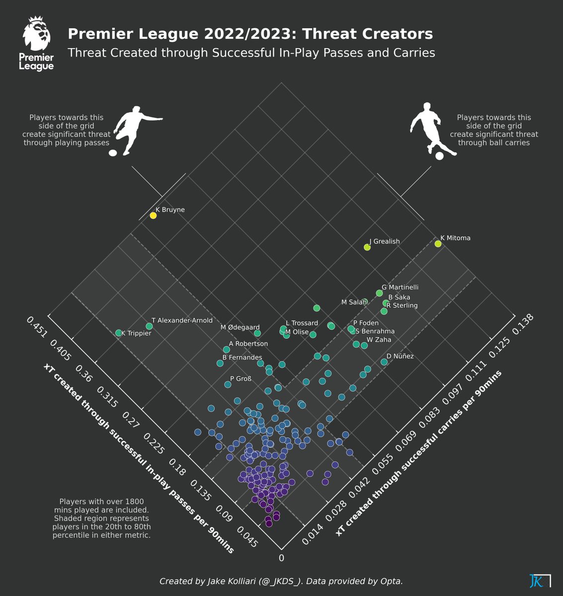 De Bruyne, TAA & Trippier lead the way by threat created through in-play passes. Mitoma and Grealish lead by threat created through carries. (3/14)