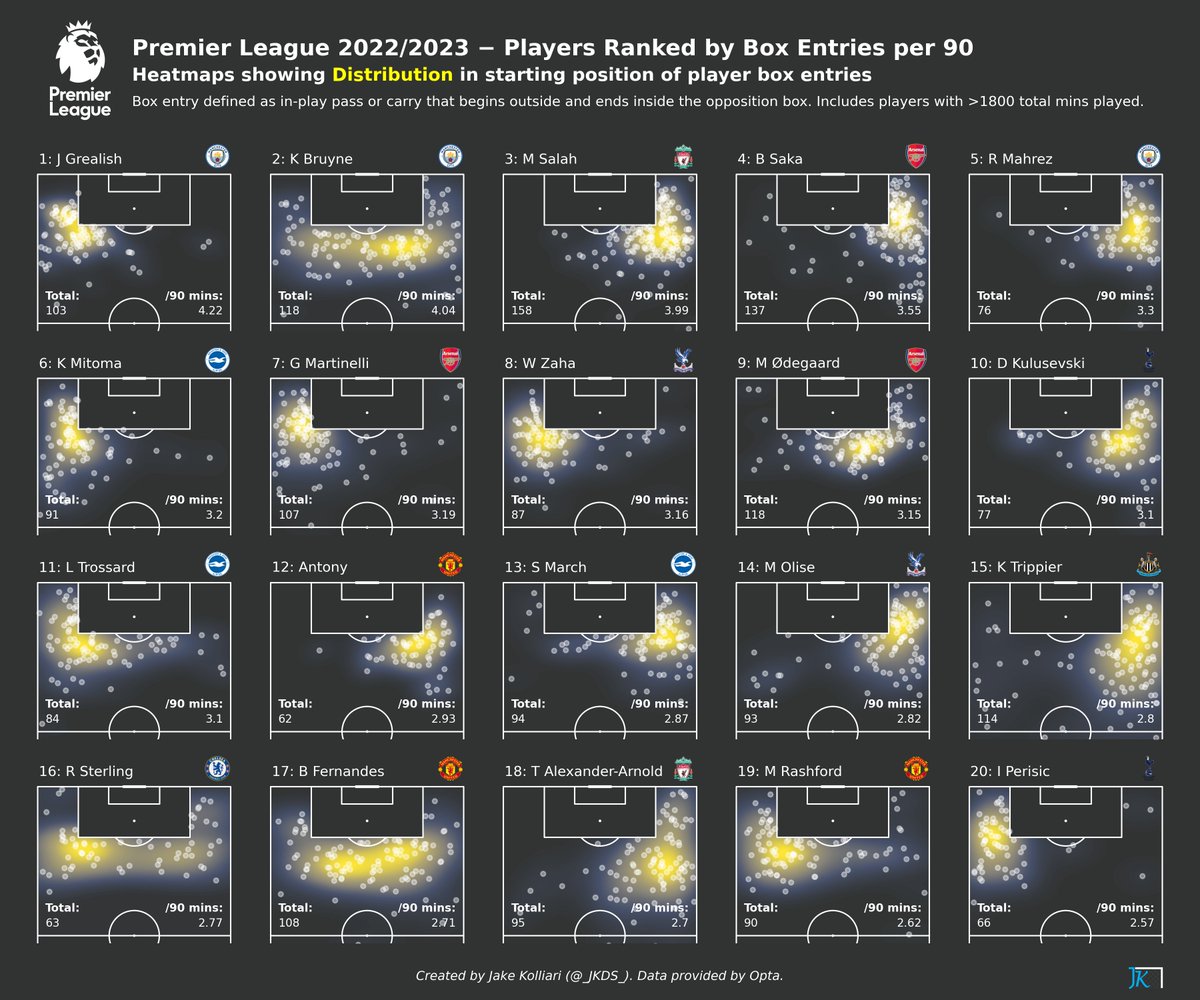 Players ranked by volume of box entries per 90. Grealish, De Bruyne and Salah lead by a margin (6/14)