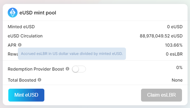 /8 $LBR FDV @ current price of $4.16 is $416m, yet Lybra protocol revenue which is calculated as 1.5% of eUSD supply which is given to esLBR stakers, at current 89m eUSD supply, is only $1.33m per year.