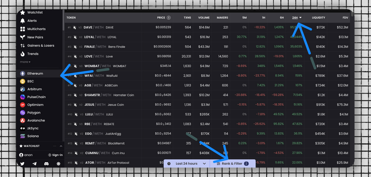 Here, you'll be able to see the fastest-growing tokens. I recommend filtering at least from a $10M FDV, selecting your desired network, and sorting by 24-hour change.