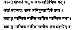 8. In Shukraniti weapons are classified into two main groups. They are Astra and Shastra. Weapons that are used with the help of mantra, yantra, or fire are called Shastra and other types of weapons are generally called Astra. Astra type of weapons is again classified into two, ie. nalikam and mantrikam.