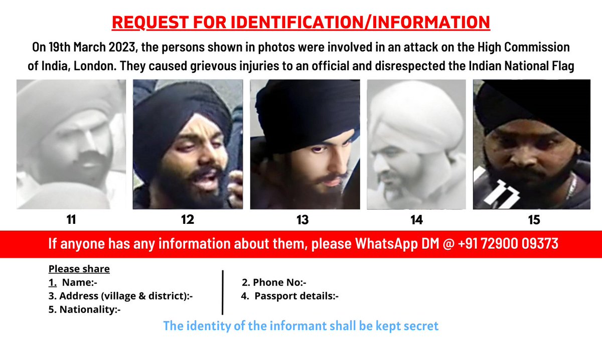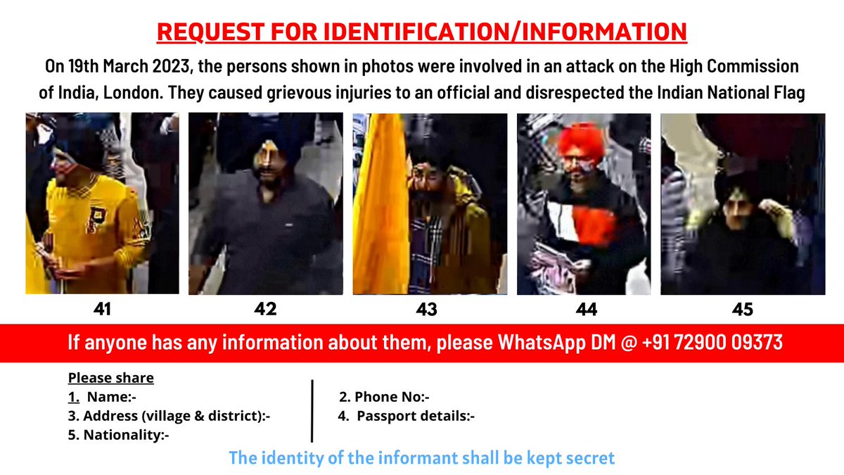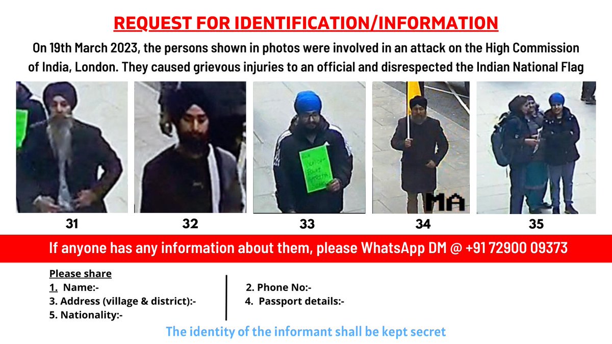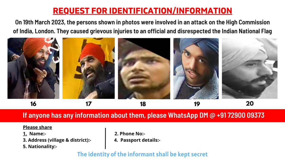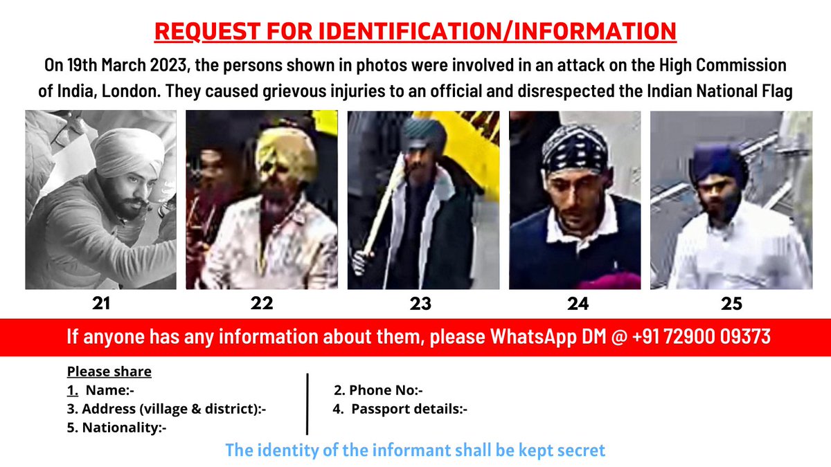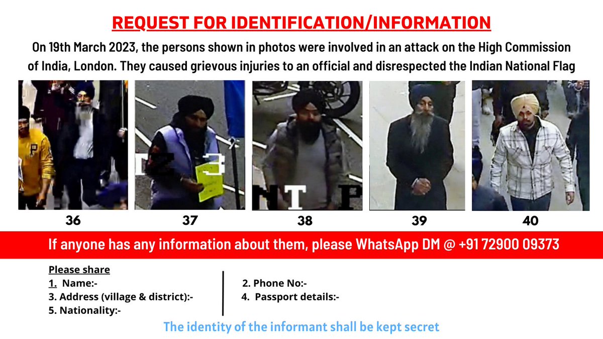 REQUEST FOR IDENTIFICATION/INFORMATION On 19.03.23 these persons were involved in an attack on the High Commission of India, London. They caused grievous injury and disrespected the Indian National Flag If anyone has any information about them, please Whatsapp/DM @+917290009373