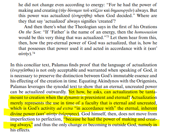God is for ever all powerful, capable of all acts (dynamis) but he isn't eternally doing all of his energies (energeias)