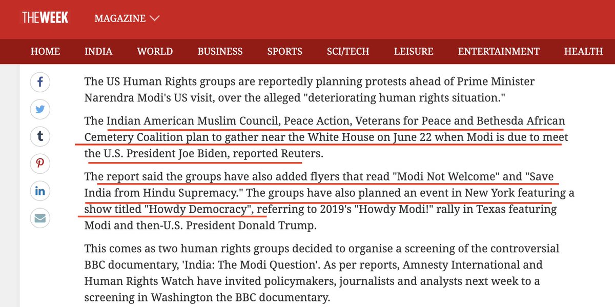Anti-India, anti-#Hindu forces are preparing to protest against PM Modi's US visit. Jamat-e-Islami's IAMC, Peace Action, Veterans for Peace and Bethesda African Cemetery Coalition have made a coalition called "Reclaiming Democracy in India". Who are they? Let's take a look. 1/7