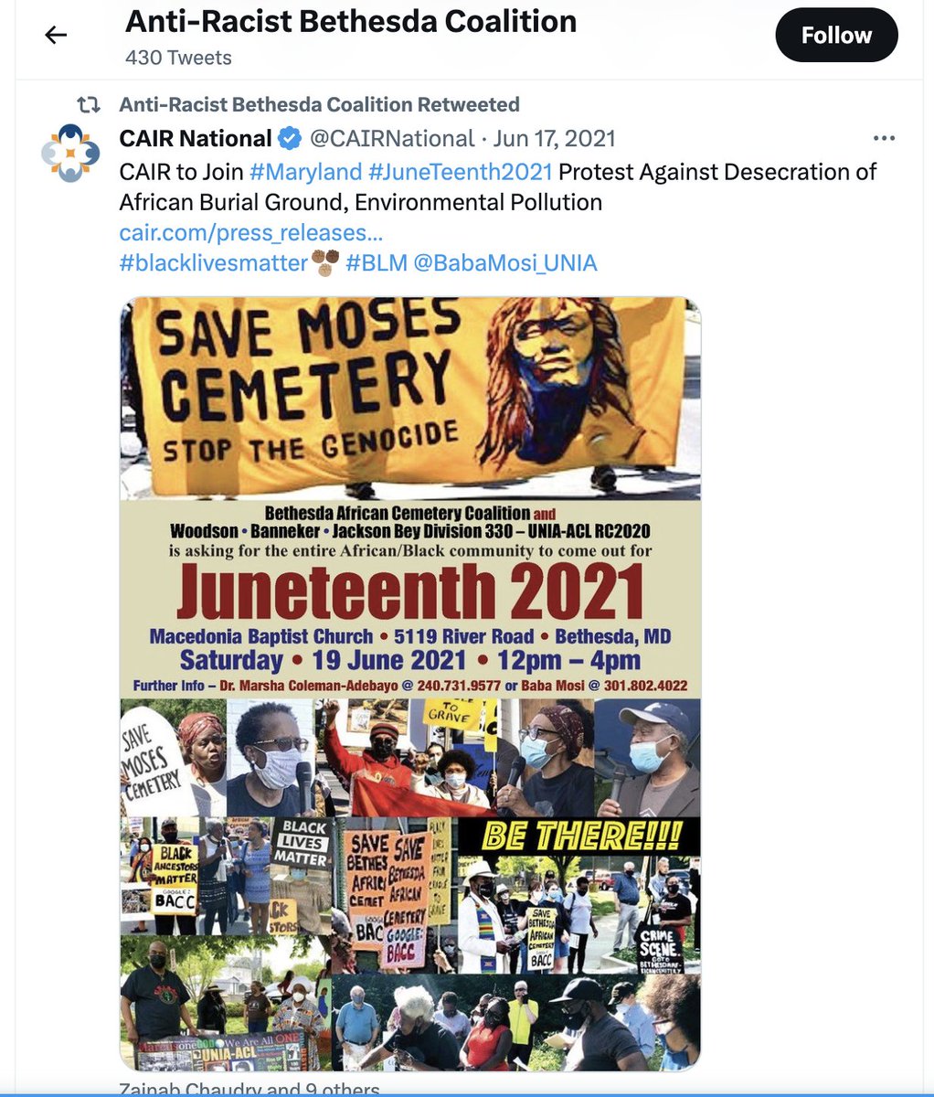 4. Bethesda African Cemetery Coalition - Has nothing to do with India or #Hindus. They work for Black lives but get support from Muslim Brotherhood's CAIR. 6/7