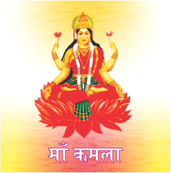 Ma Kamala is dressed in red, adorns golden jewellery. She has golden complexion & four arms. In two arms, she holds lotus flowers and with remaining two arms she makes boon-giving and being-fearless gestures or Varada and Abhaya Mudra respectively.