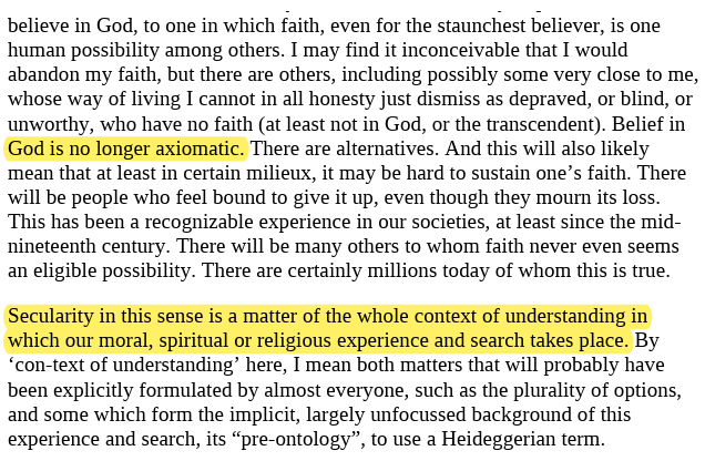 Secularity, in this sense, is the idea that being "a staunch believer in God is just another possibility," (p.3) as opposed to the pre-secular age where not believing in God was virtually impossible.
