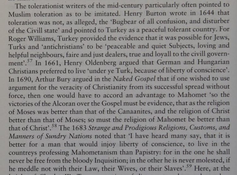 The tolerationists of the mid-century particularly often pointed to Muslim toleration as to be “imitated”. Henry Burton wrote in 1644 [..] pointed to Turkey as a peaceful, tolerant country. For Roger Williams, Turkey provided the evidence that it is possible for Jews, Turks,