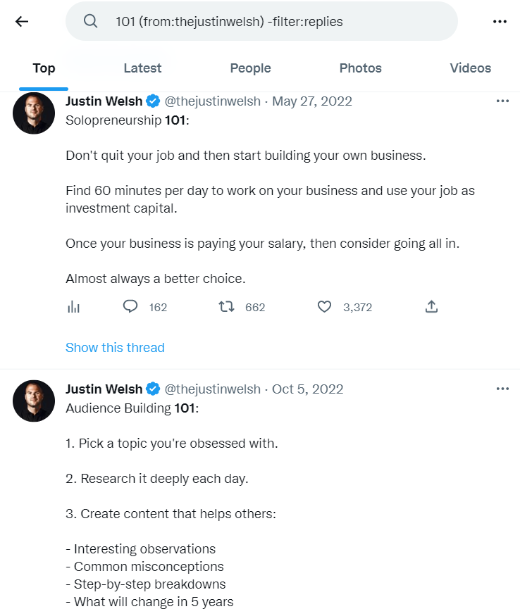 Let's find all tweets by @thejustinwelsh about his "101 Series" excluding replies