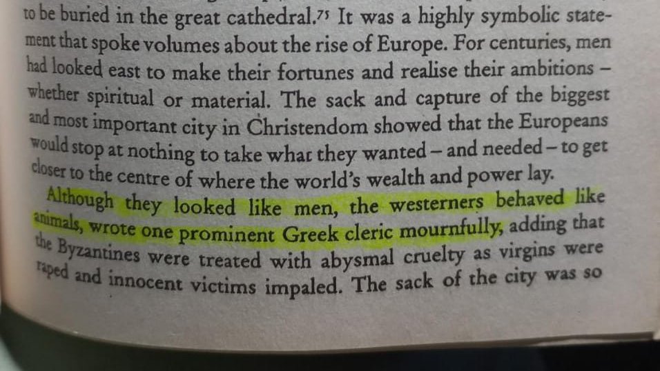 "The Byzantines, the Crusaders were told, were worse than the Jews; 'they are the enemies of God." (p. 154)
