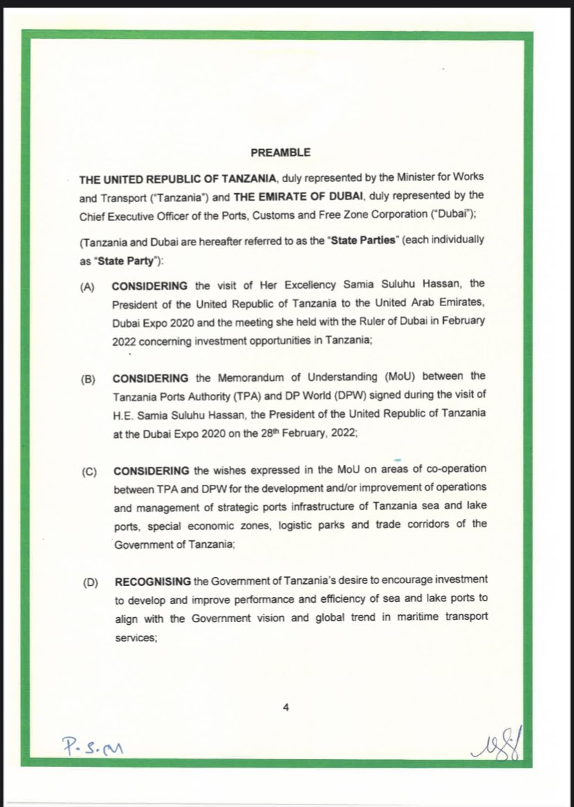 JAMHURI YA MUUNGANO WA TANZANIA, ikiongozwa na Waziri wa Kazi na Usafirishaji ("Tanzania") na EMIRATI YA DUBAI, ikiongozwa na Afisa Mtendaji Mkuu wa Mamlaka ya Bandari, Forodha na Eneo Huru ("Dubai"); (Tanzania na Dubai hapa baadaye zitajulikana kama…