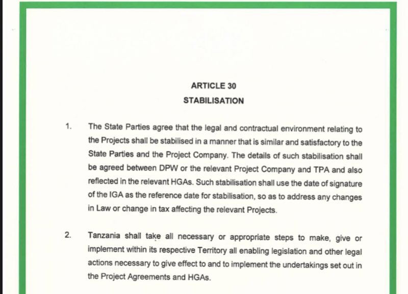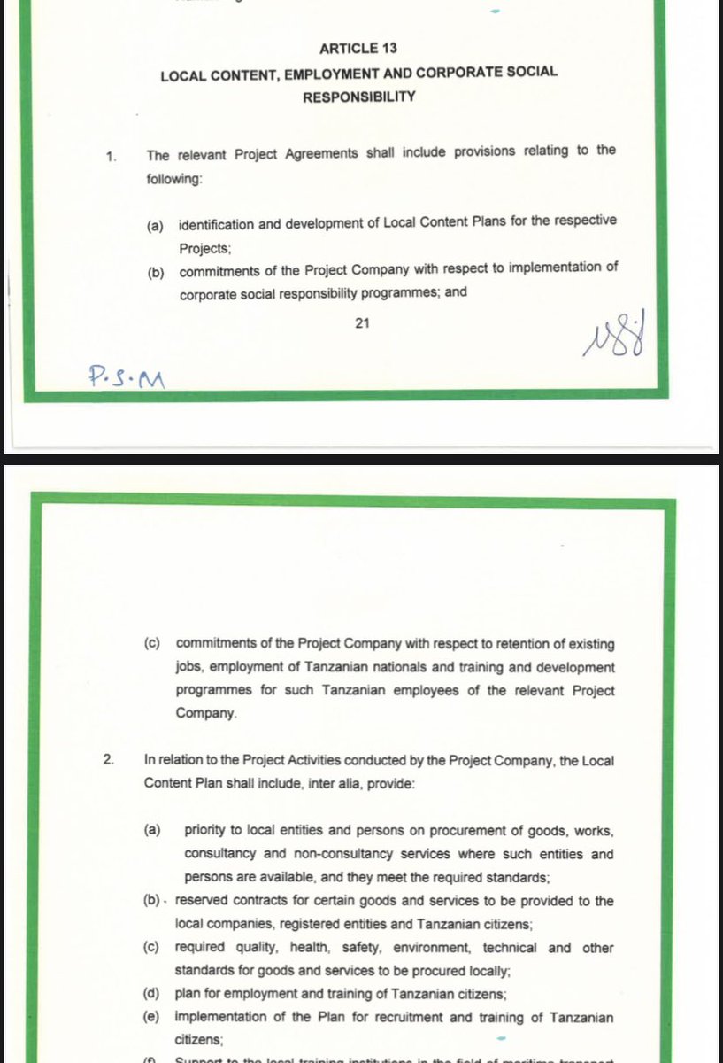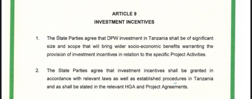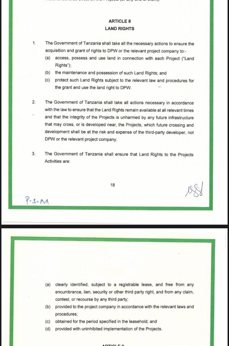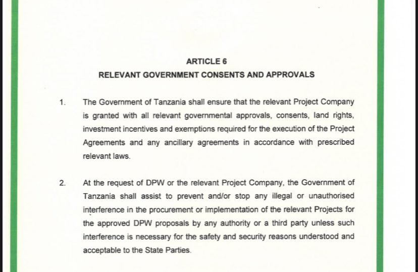 1. Serikali ya Tanzania itachukua hatua zote muhimu kuhakikisha upatikanaji na utoaji wa haki kwa DPW au kampuni husika ya mradi kwa:-