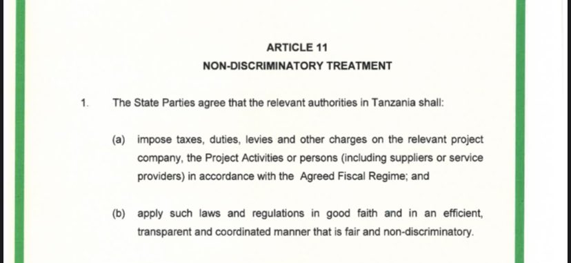 1. Tanzania inathibitisha kuwa shughuli za Mradi, uwekezaji au mali za washiriki wa mradi katika Mradi, ikiwa ni pamoja na Mifumo ya Mradi au mali nyingine za kimwili au zisizo za kimwili za Kampuni ya Mradi au hisa katika, au mikopo kwa…