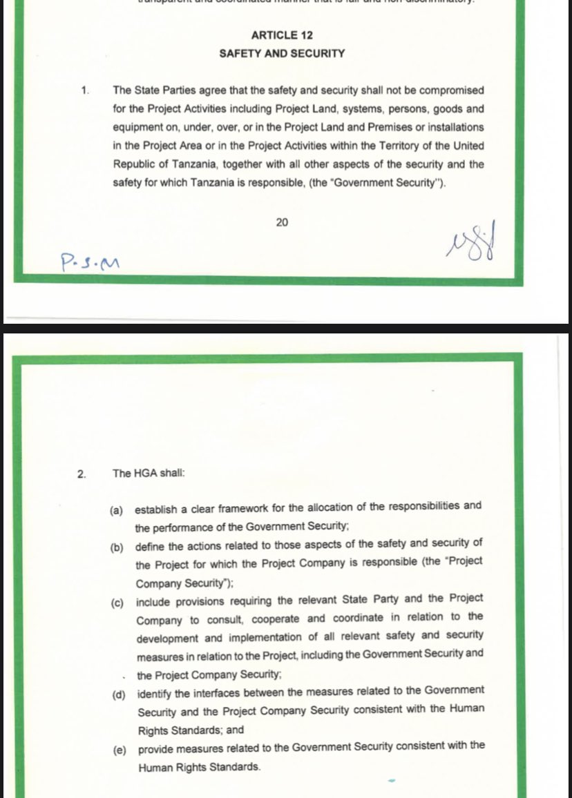 Nchi Wanachama wanakubaliana kuwa usalama na ulinzi hautasitishwa kwa Shughuli za Mradi ikiwa ni pamoja na Ardhi ya Mradi, mifumo, watu, bidhaa na vifaa vilivyoko, chini, juu au ndani ya Ardhi ya Mradi na Majengo au miundombinu…