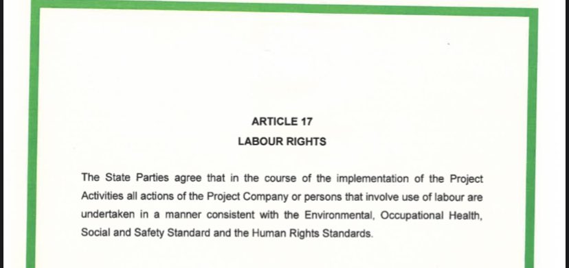 Nchi Wanachama wanakubaliana kwamba katika utekelezaji wa Shughuli za Mradi, hatua zote za Kampuni ya Mradi au watu ambao zinahusisha matumizi ya nguvu kazi zinafanywa kwa njia inayolingana na Viwango vya Mazingira, Afya ya Kazini,…