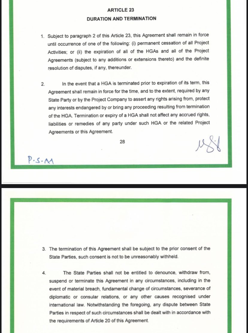 1. Isipokuwa kwa kifungu 2 cha Makala hii ya 23, Mkataba huu utaendelea kuwa halali hadi kutokea moja ya mambo yafuatayo: (i) kukomeshwa kudumu kwa shughuli zote za Mradi; au (ii) kumalizika kwa HGA zote na Mikataba ya Mradi (kwa…