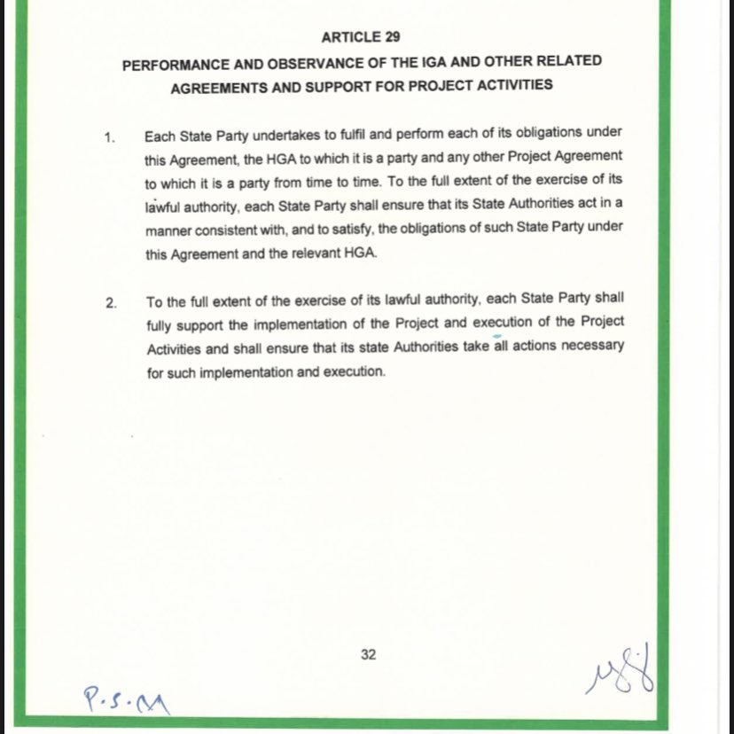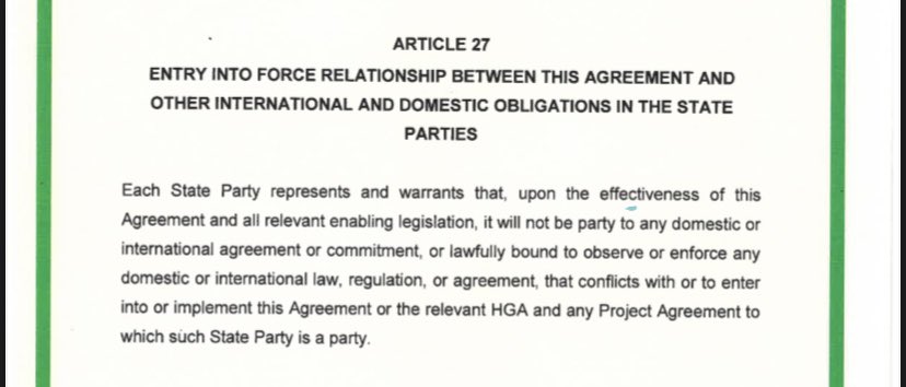 1. Kila Nchi Mwanachama inakubali kutimiza na kutekeleza majukumu yake chini ya Mkataba huu, HGA ambayo ni sehemu, na Mkataba wowote wa Mradi ambao ni sehemu…