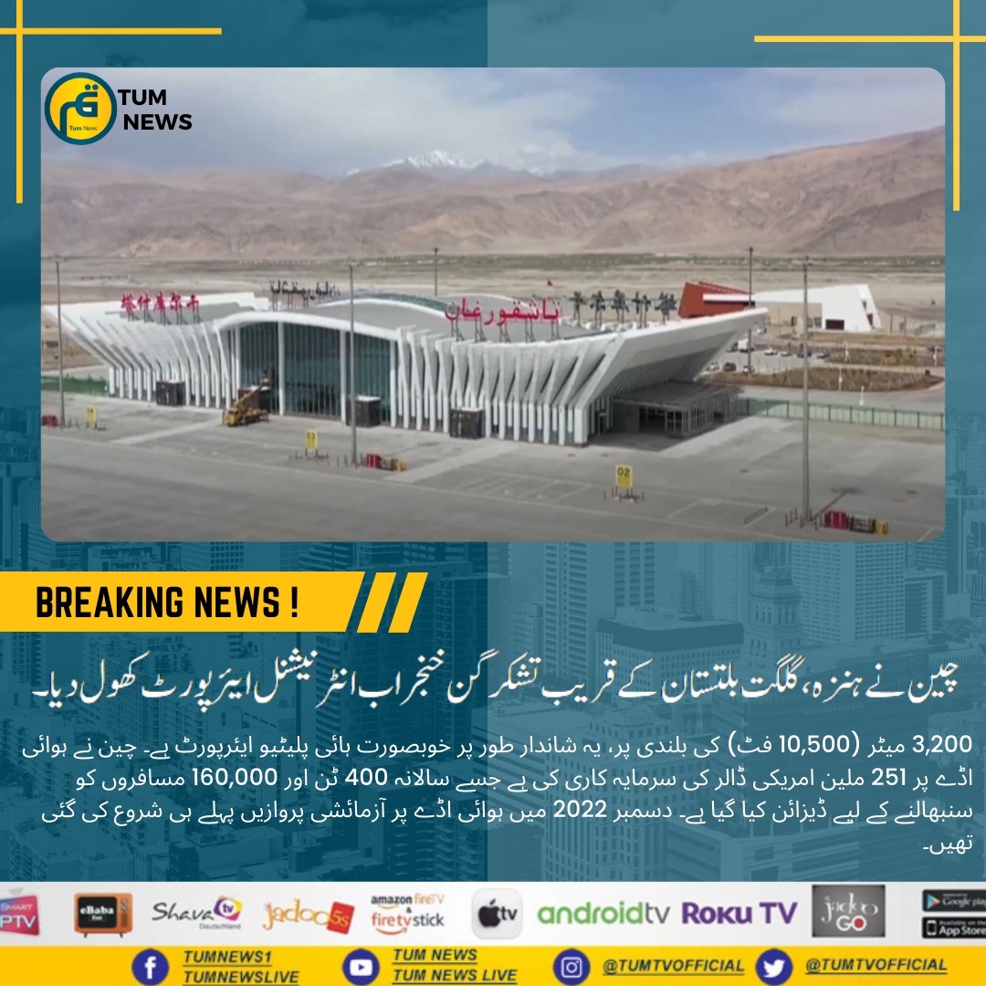 #China has inaugrated Taksargan Khunjerab International Airport at an hours drive from Khunjerab pass, #Hunza, Gilgit-Baltistan. At a cost of $251 million, airport has a 3200m air strip at an elevation of 10000ft. The test flights were started in Dec 22.