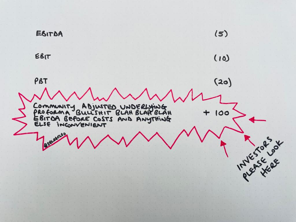 E.g. classifying certain costs as being โbelow EBITDAโ in the Income Statement.