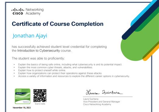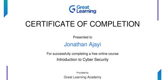 In November last year 2022, I made a choice to diversify my career options, Cyber security was my choice. I started with an Introduction to Cyber Security from @Cisco, and after that, I took another Introduction to Cybersecurity from Great Learning Academy.