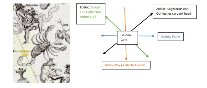 Next to Taurus is Orion while opposite the Ecliptic Ophiuchus stands on the Scorpion's Tail. Orion and Ophiuchus mark the Golden Gate and Silver Gate of the Souls, in one Gate Souls enter into the Material Realm, the other Gate Souls depart the Material Realm.