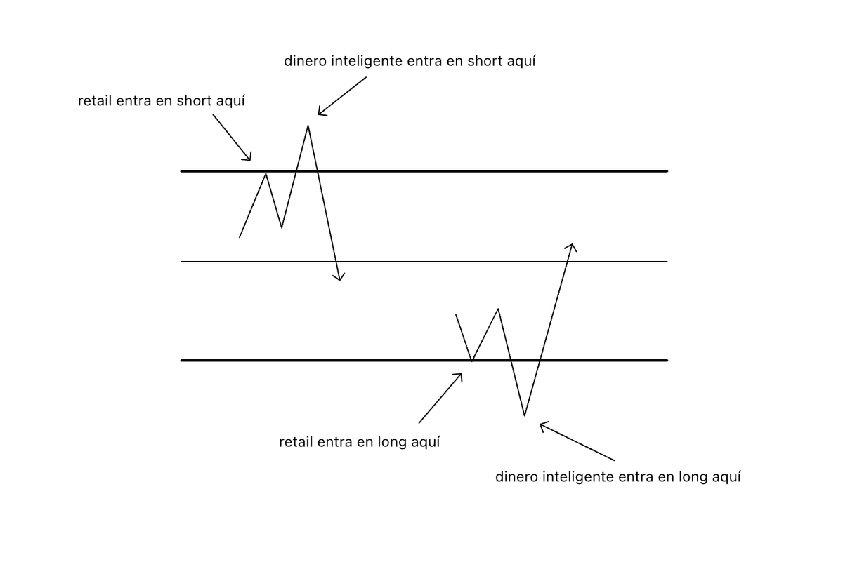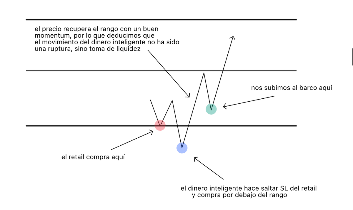 Durante la formación de este rango, los institucionales van creando liquidez a ambos lados y creando dudas al inversor retail de hacia dónde será el próximo movimiento del precio.