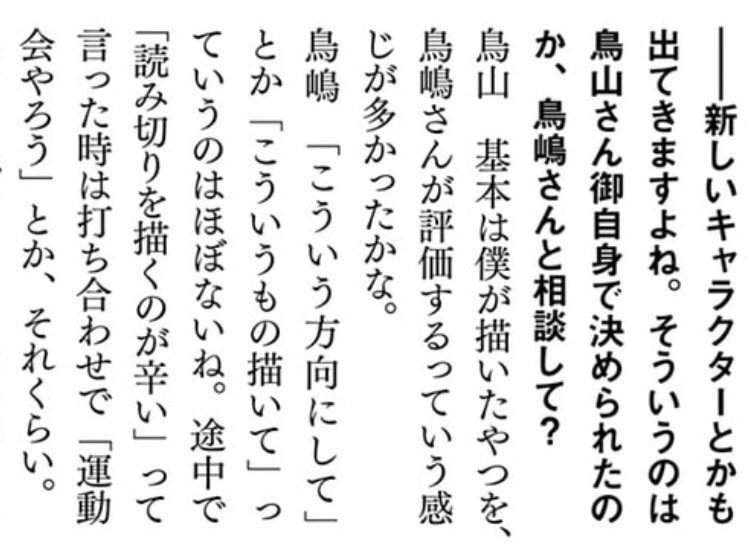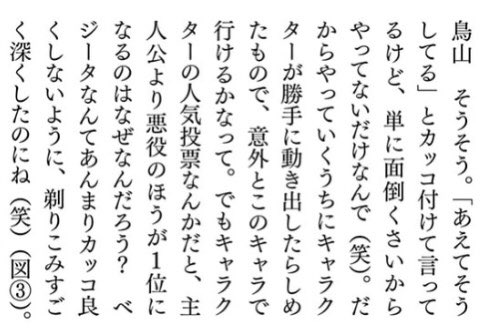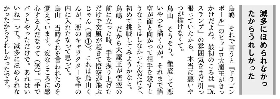 While the praise made Toriyama happy, he also thought it was an odd thing for Torishima to be impressed by. Meanwhile, Torishima thinks he praised Toriyama plenty, though Toriyama denies this.
