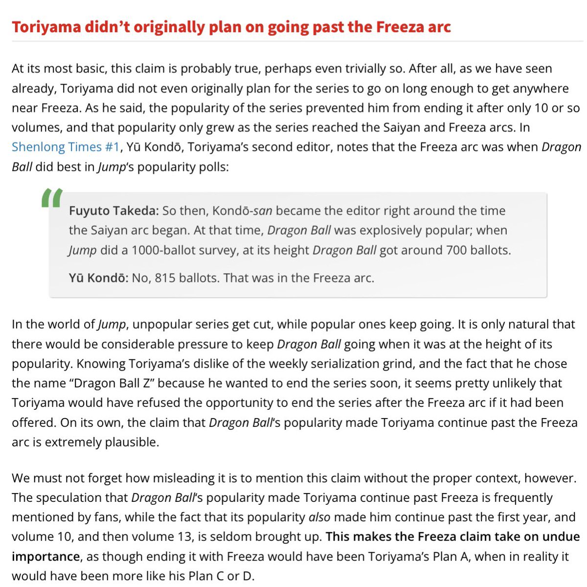 But Torishima recognizes DB was too popular for that. Naturally, this ties into the whole “intended endings” kerfuffle. Long story short, DB’s popularity made Toriyama continue it longer than he liked, but he never had a master plan to end it with Freeza. kanzenshuu.com