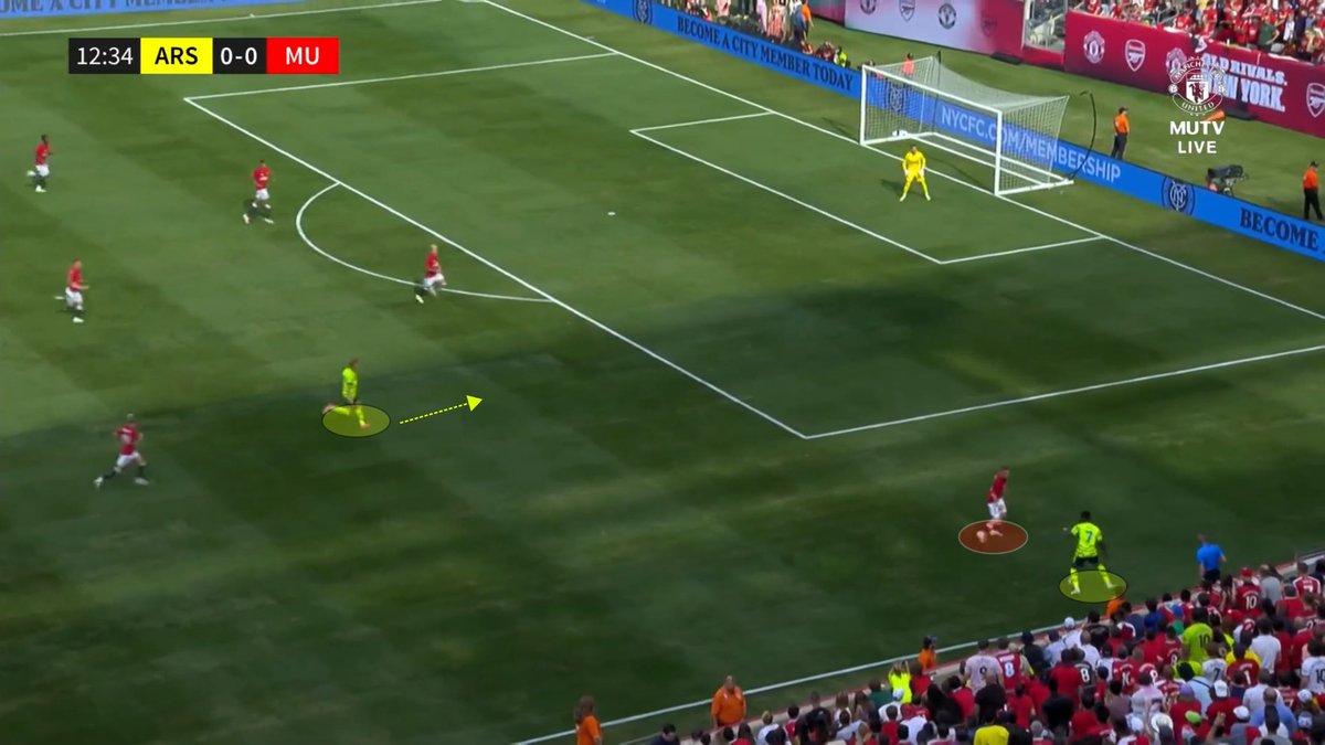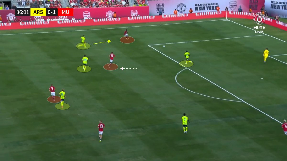 Because United using a +1 in their backline to cover, Gabriel is the free man, so Antony had to move closer to him, but this creates a 2v1 against Mainoo with Havertz and Tomiyasu.