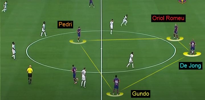 El cuadrado le da alta estabilidad al Barça. Por supuesto con balón con ese pase extra que tanto cuesta de tapar a los rivales (también ayer al Madrid en la primera media hora).