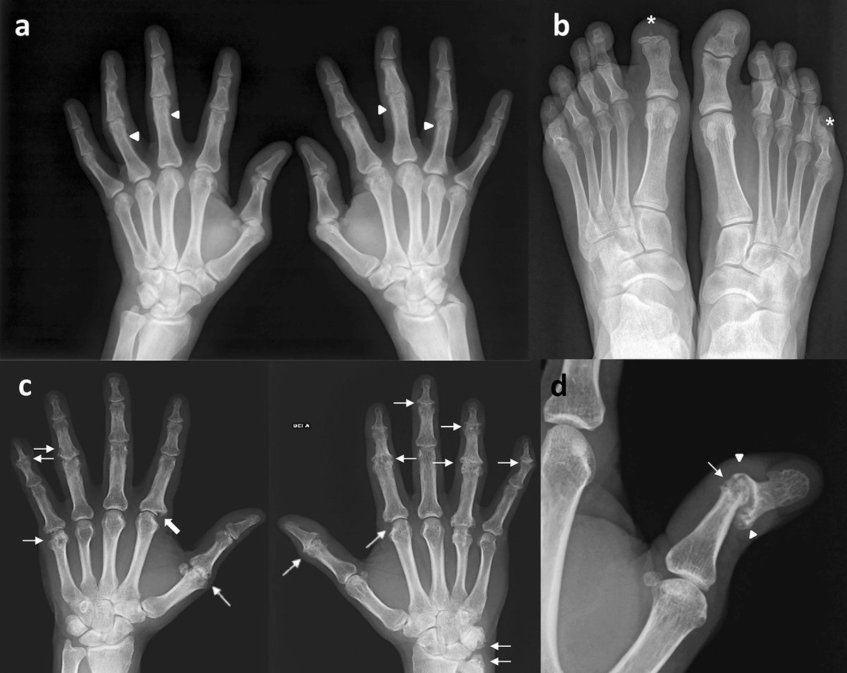 Bony erosions narrowed the end of the proximal phalange as a βpencilβ (thin arrows)
