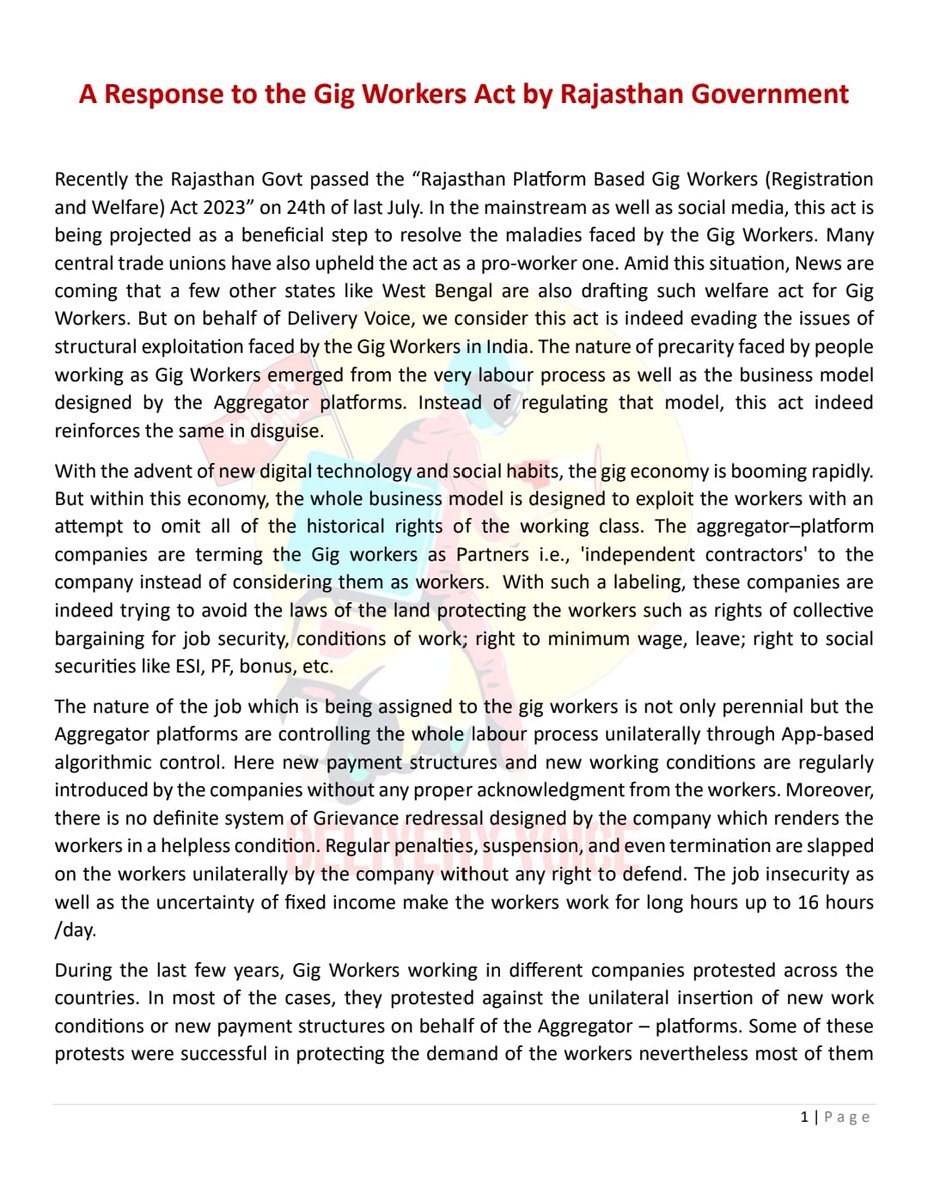 The 'Rajasthan Platform Based Gig Workers Act 2023' is hardly the progressive act, it is being made out to be. It seriously fails to address the structural concerns of formalisation of employer-employee relations between the workers and the aggregators. It merely ensures the