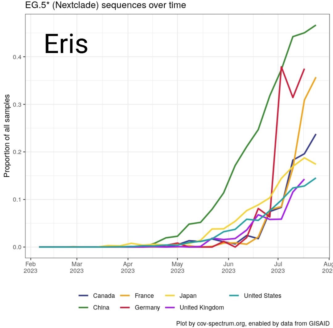 @TRyanGregory Das deutliche Wachstum der Anteile von #Eris an den Sequenzierungen in verschiedenen Ländern veranschaulichen diese aktuellen Daten von @TRyanGregory ⬇️.