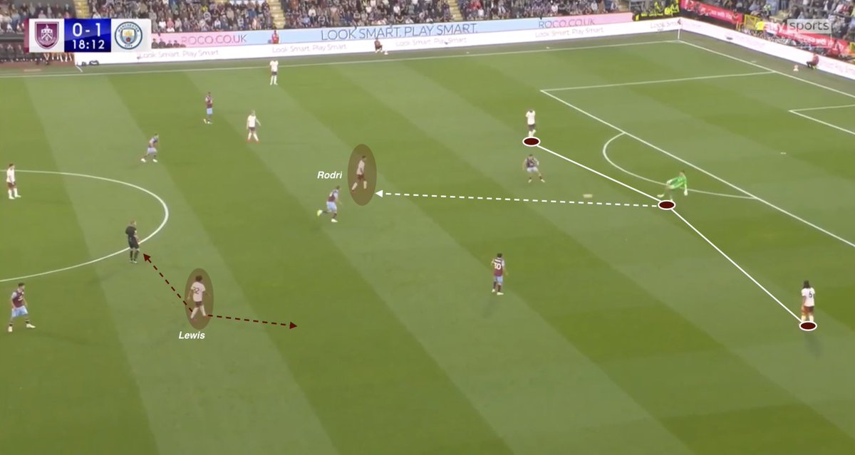 Ederson stepping up and form this line of 3 with center backs forces Burnley to modify its man-to-man press, liberating more space for Rodri to move around the structure. Lewis moves have another purpose, more disruptive and create uncertainty.