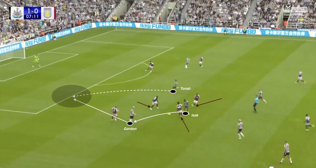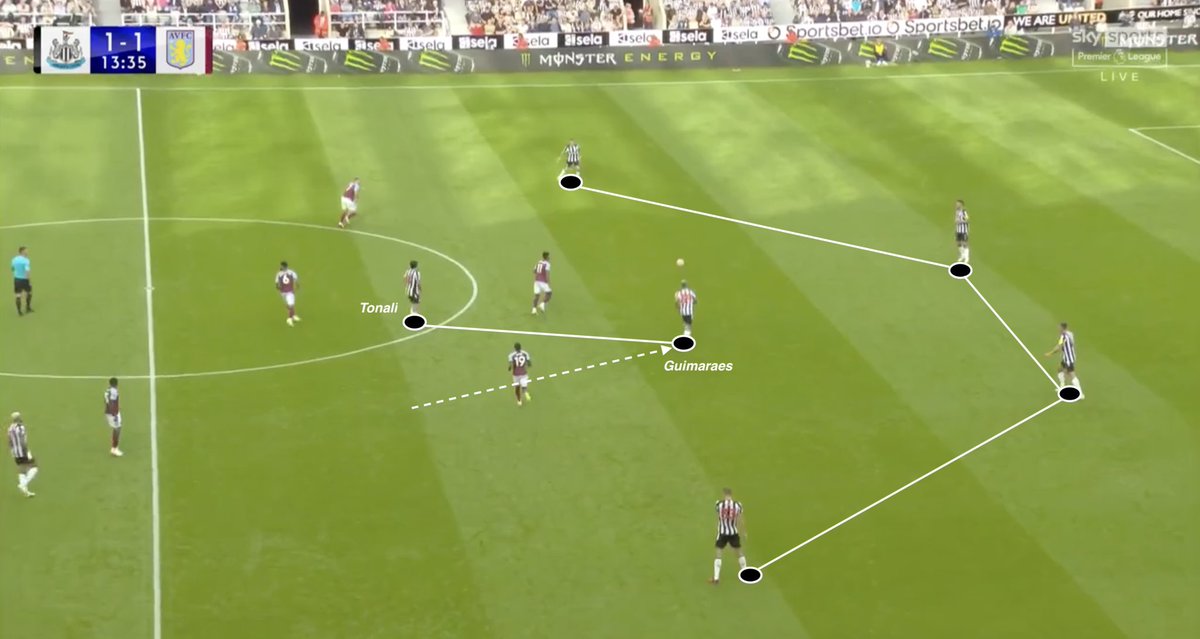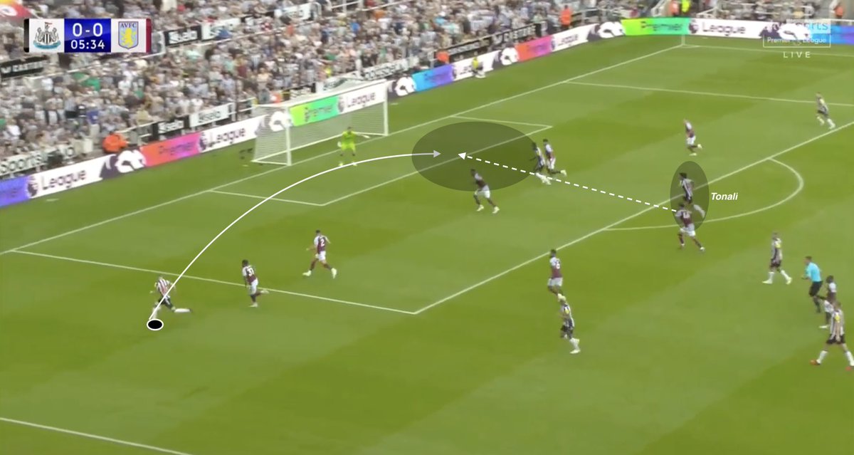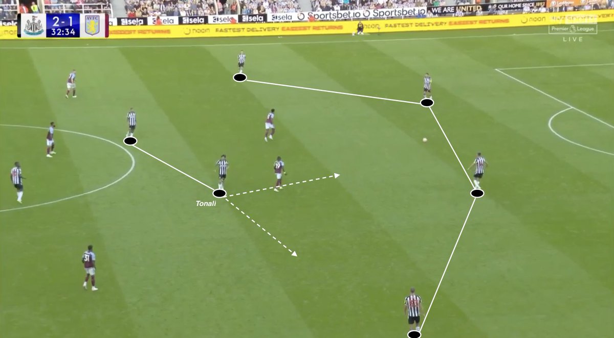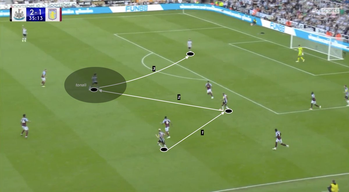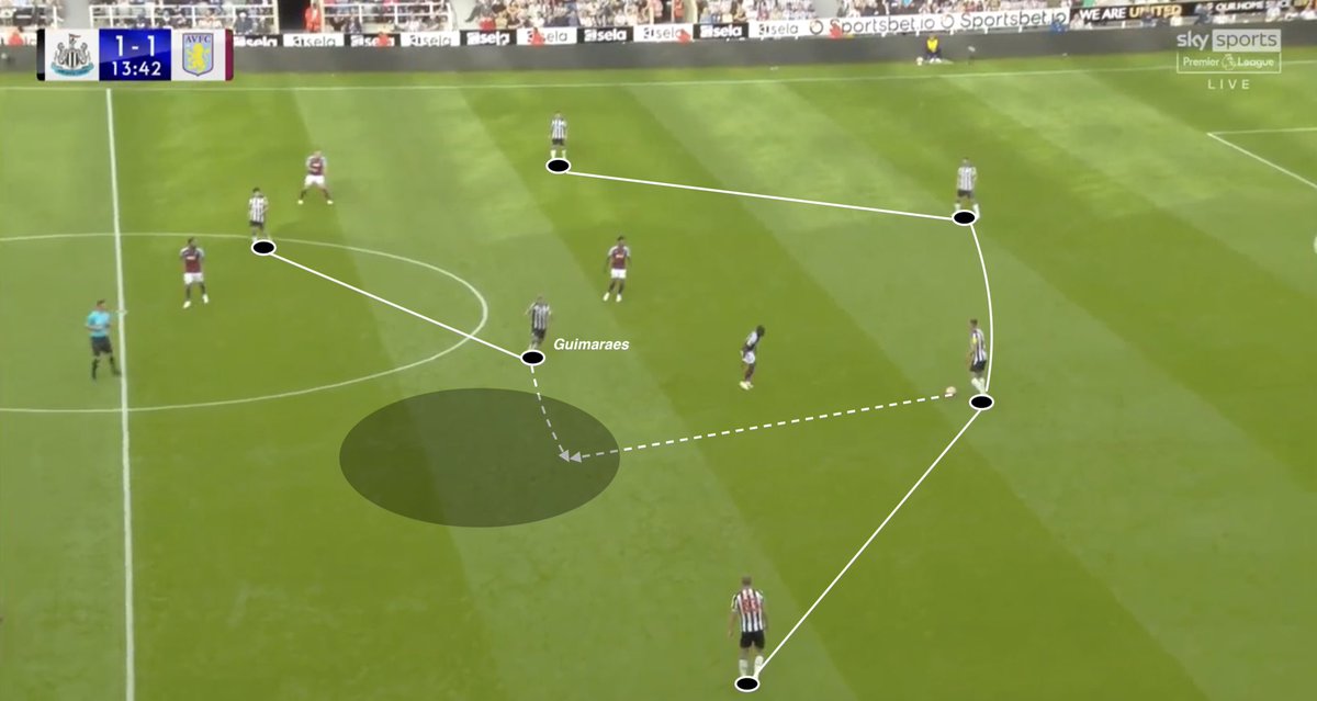 Guimaraes and Tonali manage their distance quite well, especially to bypass the press from Aston Villa. These passes schemes are important for Newcastle because as soon as they have enough space, they can have more depth in their passes : direct way of play.